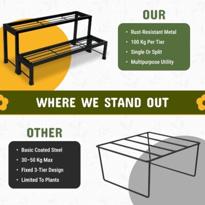 • Heavy Load Capacity – Built to hold up to 100 kg per tier, this pot stand for outdoor plants big size and planter stand for balcony easily supports heavy pots, large planters, or ceramic crocks with stability.