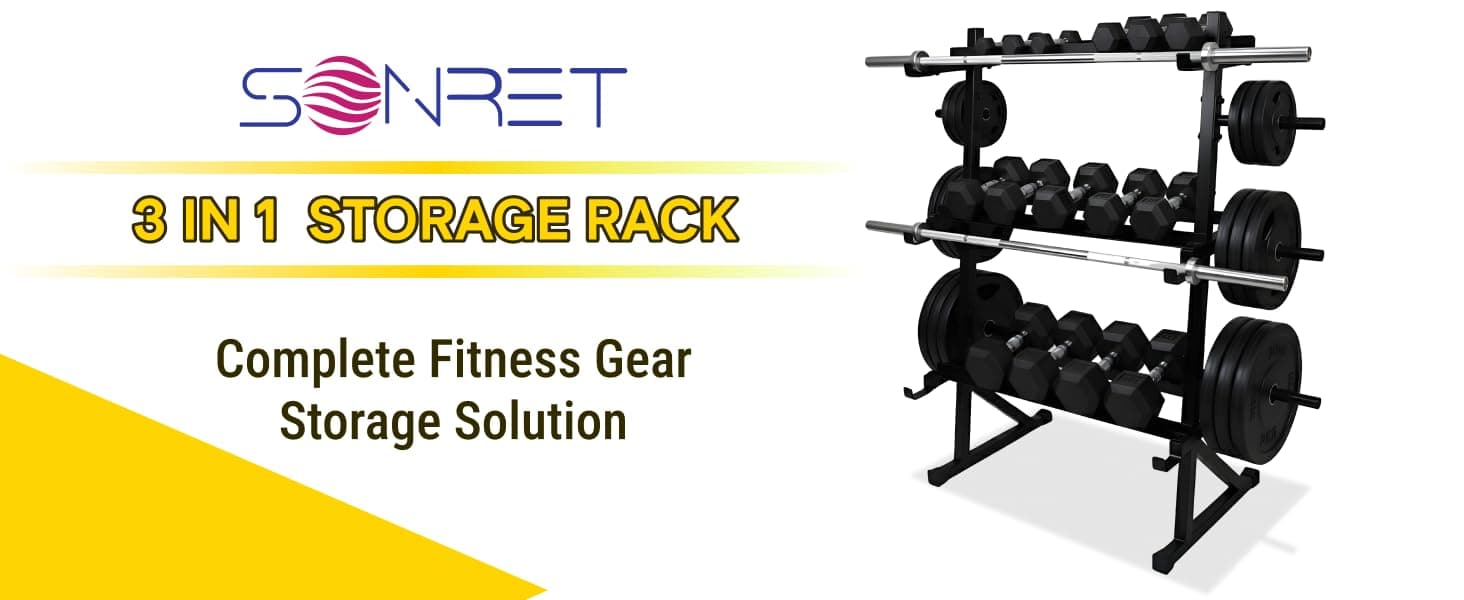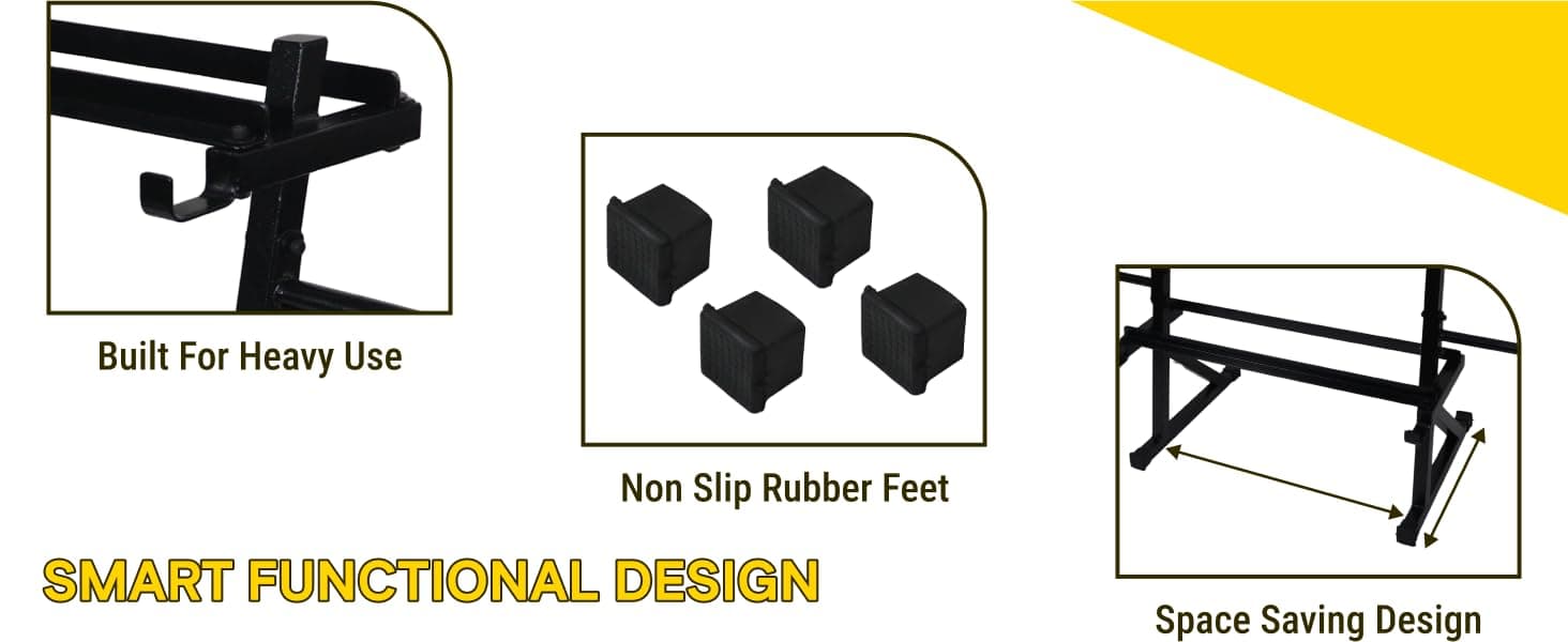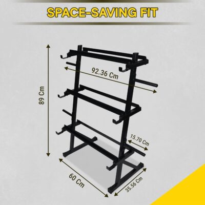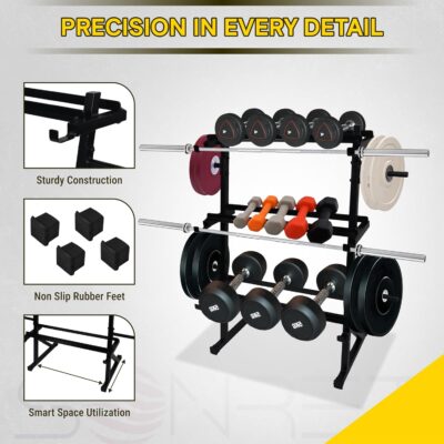 All-in-One Storage: This versatile gym rack is designed to hold barbell, weight plate, and dumbbell, making it the ultimate gym stand for home workouts