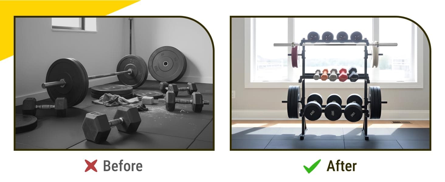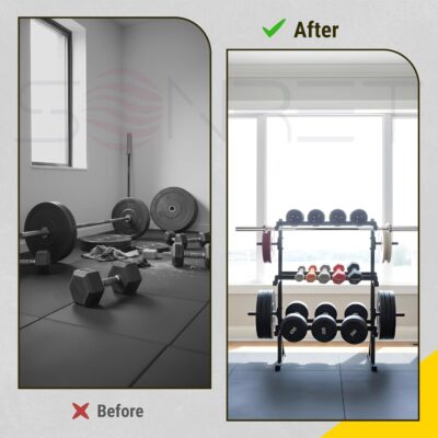 Space-Saving Design: This vertical dumbbell stand for home fits easily tight spaces, helping you organize your barbell and weight plate without cluttering your home or gym area