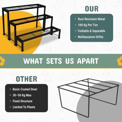 Heavy Load Capacity – Built to hold up to 100 kg per tier, this pot stand for outdoor plants big size and planter stand for balcony easily supports heavy pots, large planters, or ceramic crocks with stability.