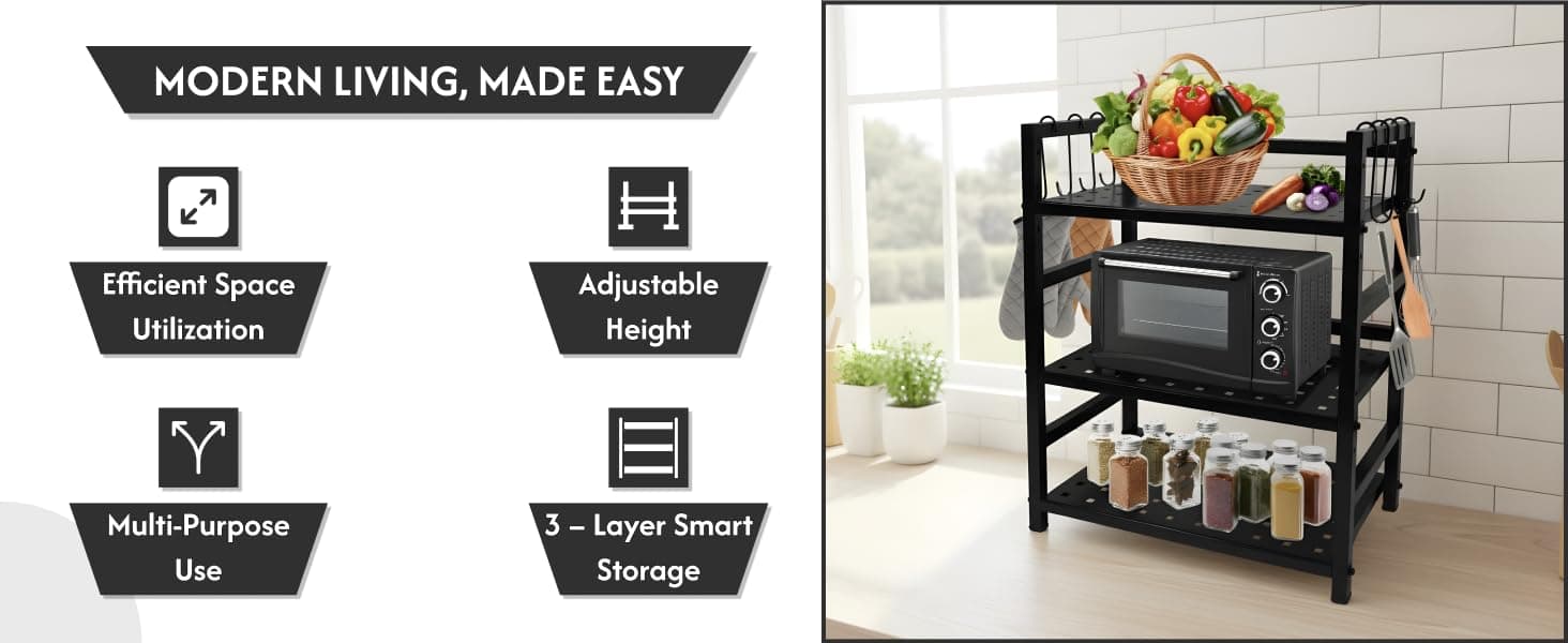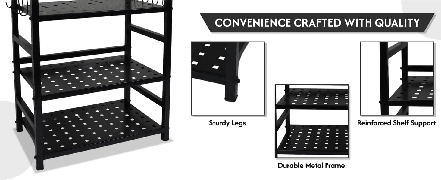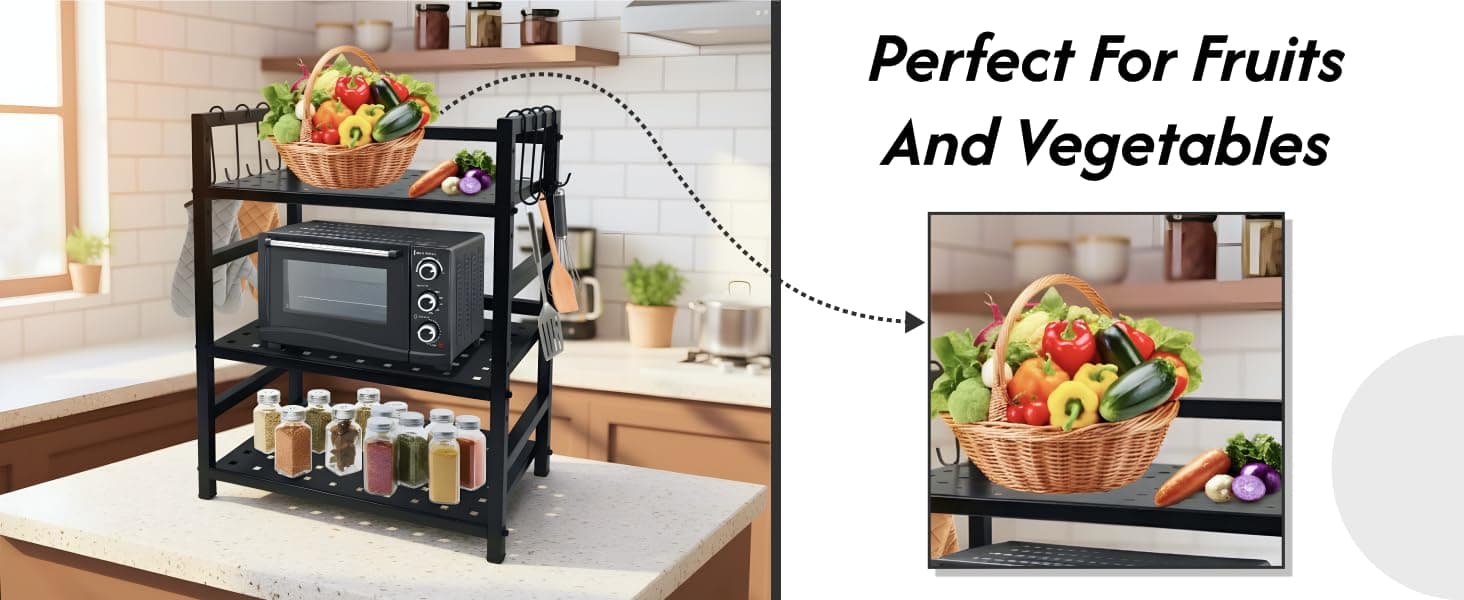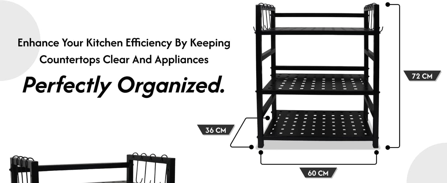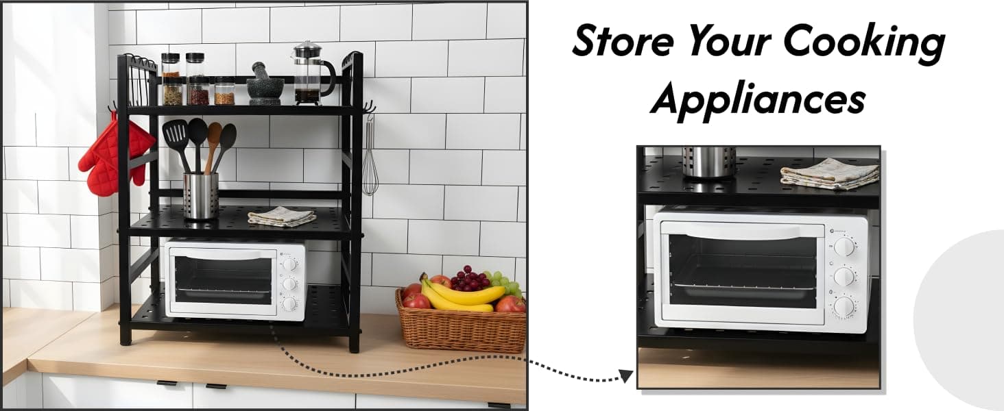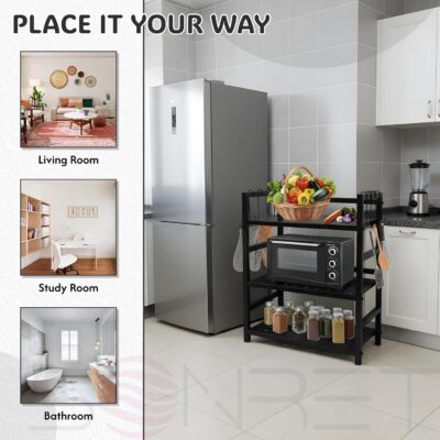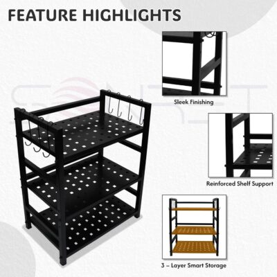 • Sturdy Construction: This 3-tier metal oven stand ideal for holding microwaves, mixer grinders, and other kitchen appliances. This microwave table for kitchen Built to support a high load capacity,