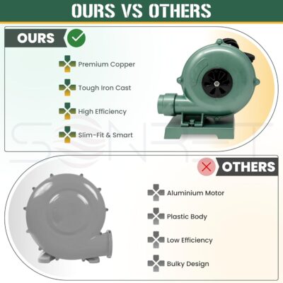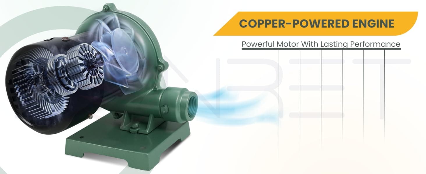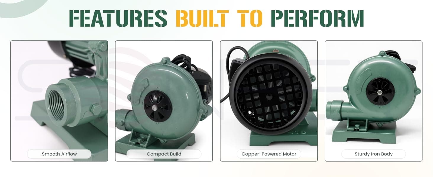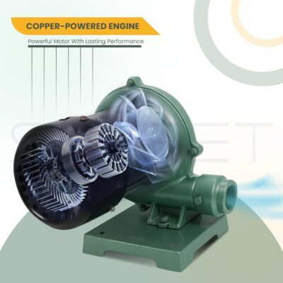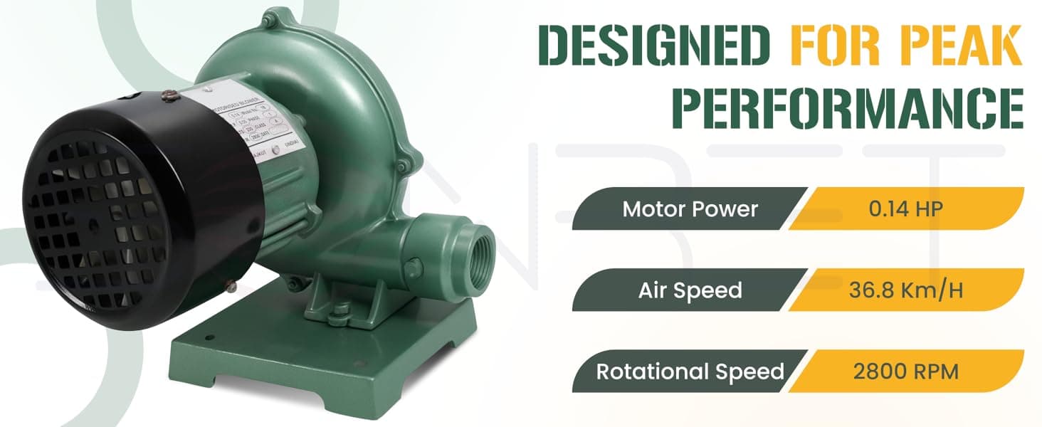 • Copper Winding Motor: This blower machine is equipped with a single-phase copper winding motor (0.1 HP, 2800 RPM) that operates on 220–240V AC, ensuring consistent airflow and reliable operation