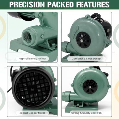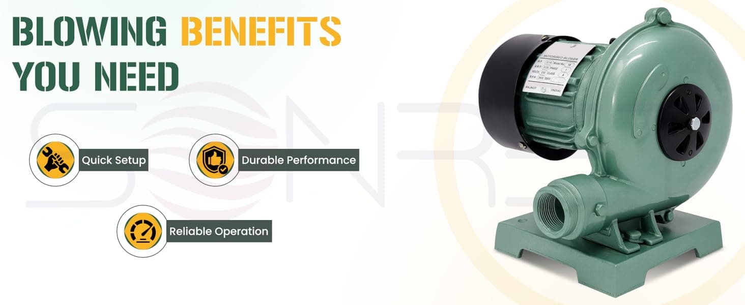 • Strong & Sturdy Construction: Electric air blower built with a robust cast iron motor body and aluminium-cast blower front, offering stand for stability in usage for industrial environments