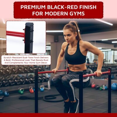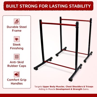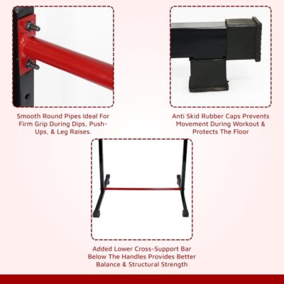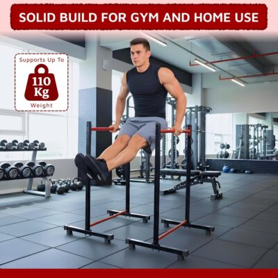 Enhanced Stability: Dips bar designed with a reinforced lower cross-support bar that provides dip stand excellent balance and during intense workouts ensuring wobble-free dip bar performance for dips, leg raises, and calisthenics training