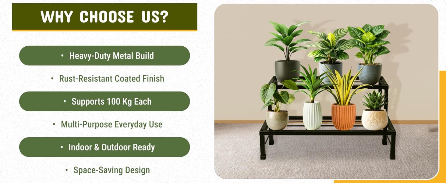Heavy Load Capacity – Built to hold up to 100 kg per tier, this pot stand for outdoor plants big size and planter stand for balcony easily supports heavy pots, large planters, or ceramic crocks with stability.