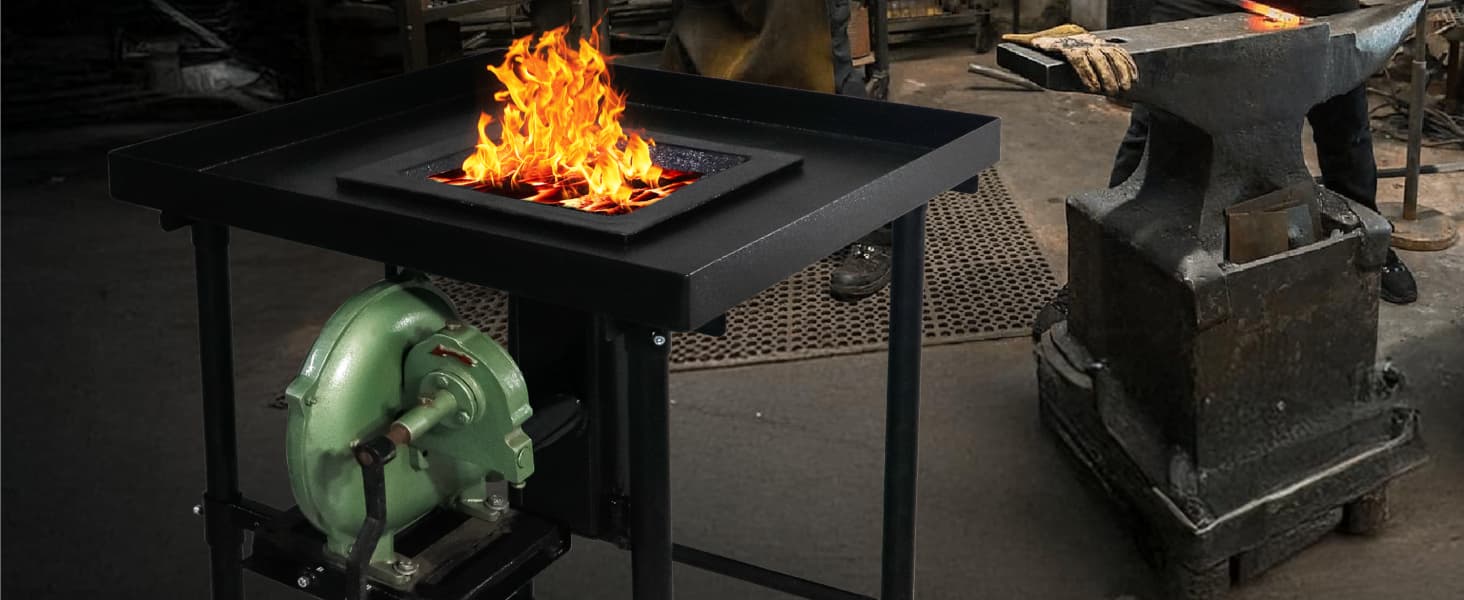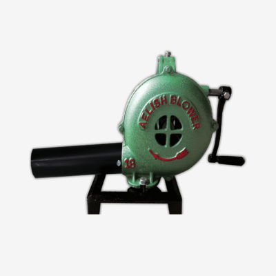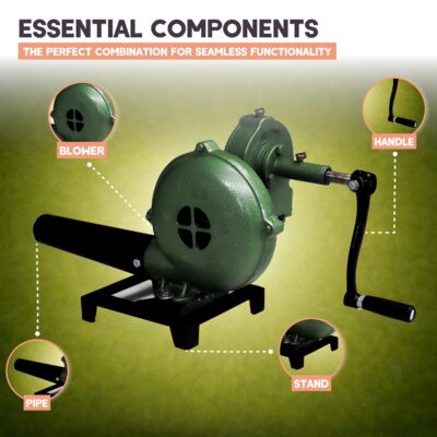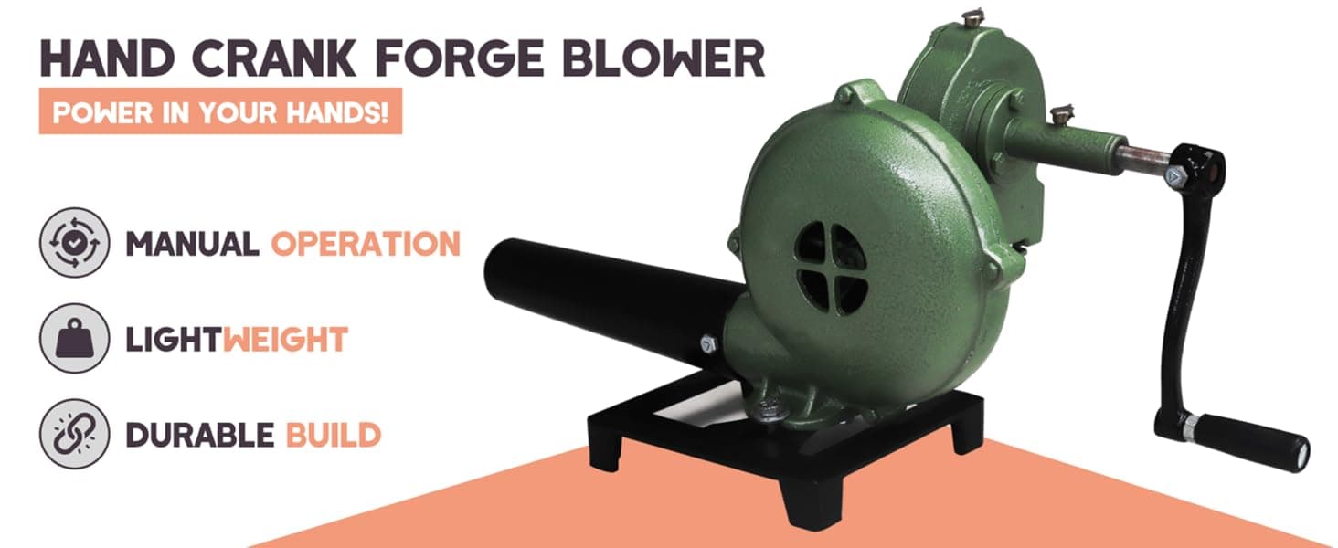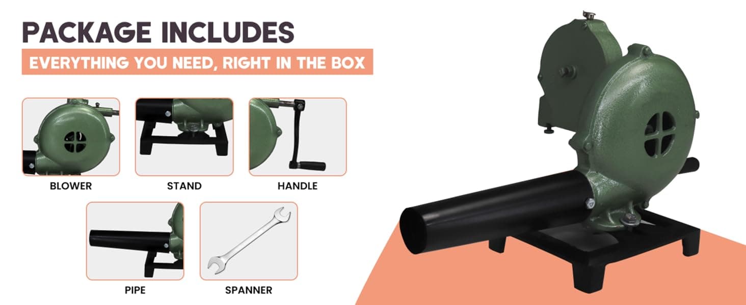 Material: This hand air blower features casing and fan blades made from cast aluminum, with steel handle, pipe, and stand. This hand blower for fire built tough for blacksmithing, coal fire use, or barbeque grill setups