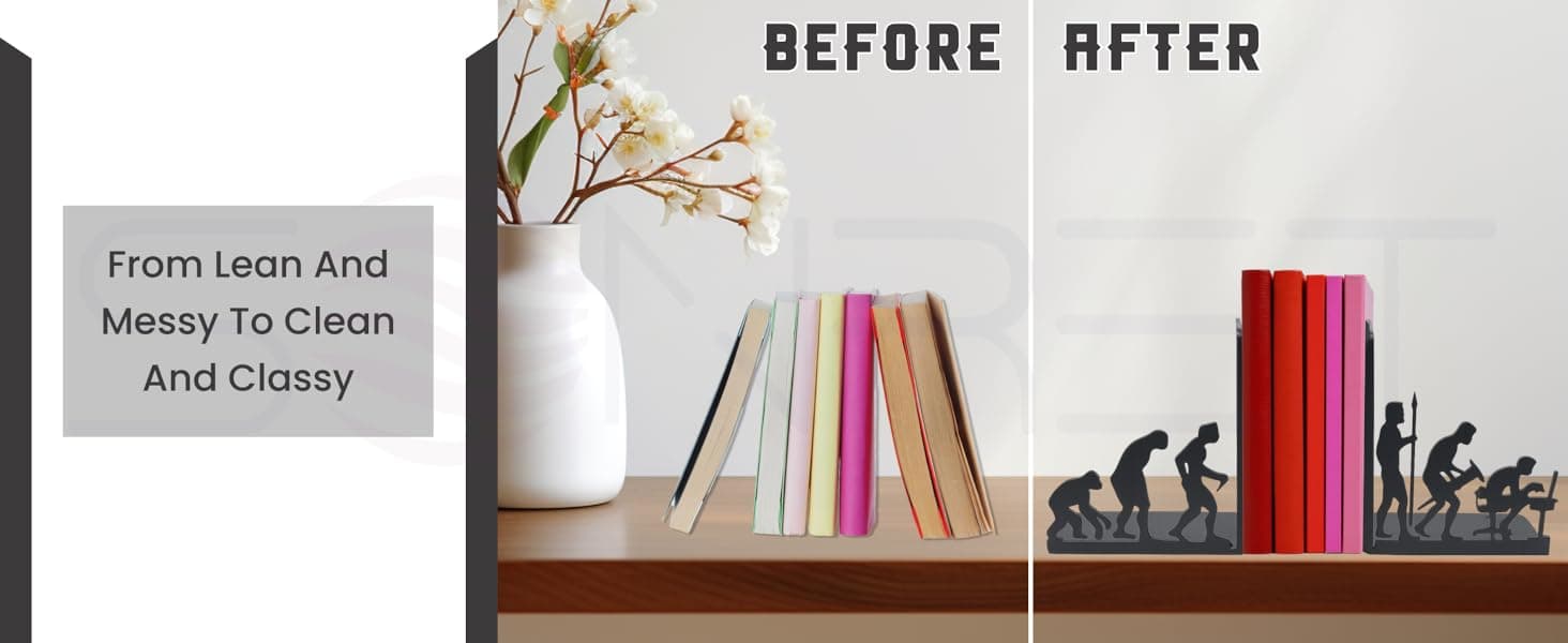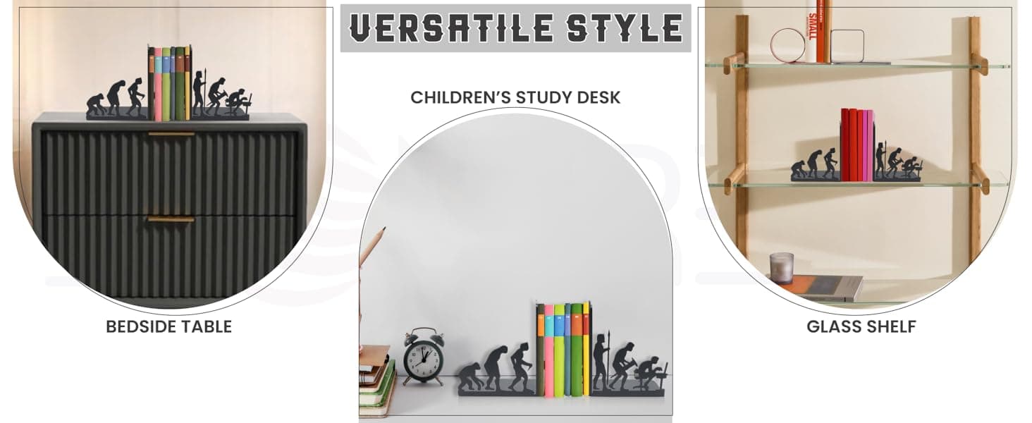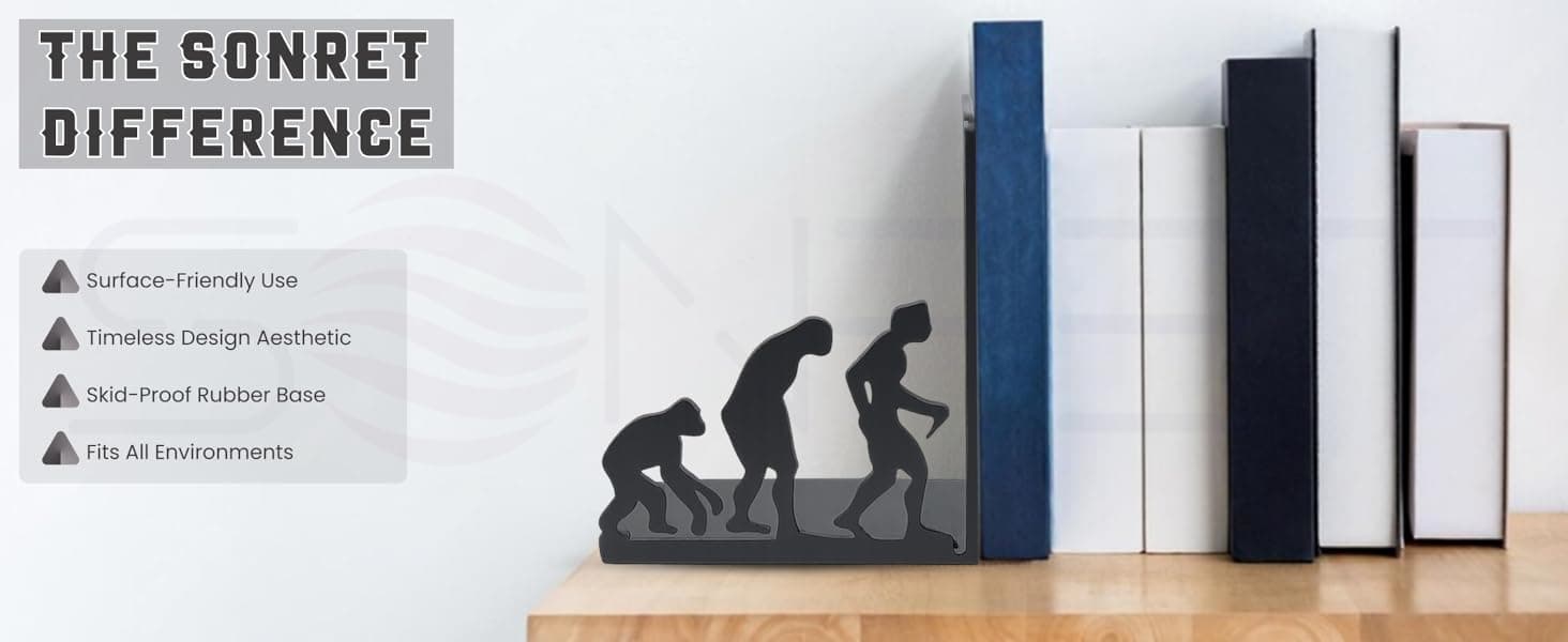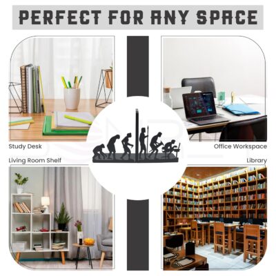 • Unique Décor + Utility in One Piece: This book organiser doubles as a library decoration item and a functional book stopper for shelf, featuring a human evolution design and fitted with anti-slip rubber pads for stability and surface protection