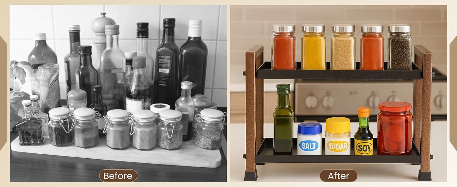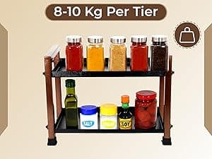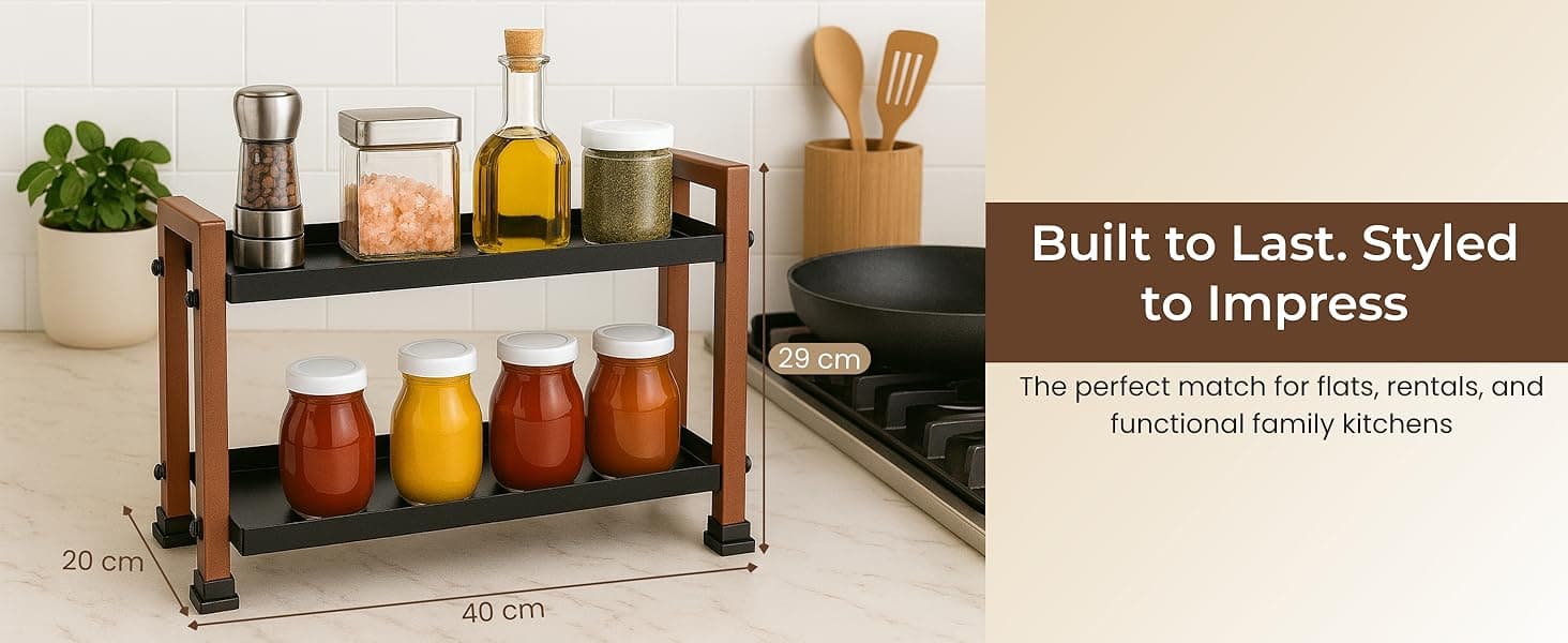 • Ideal Shelf for Oils & Spices – Perfect as an oil bottle stand, masala stand, or kitchen condiment organiser, this compact rack holds spice jars, oil bottles, and coffee containers securely while keeping your platform clean and clutter-free