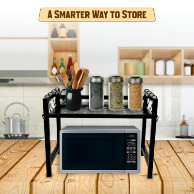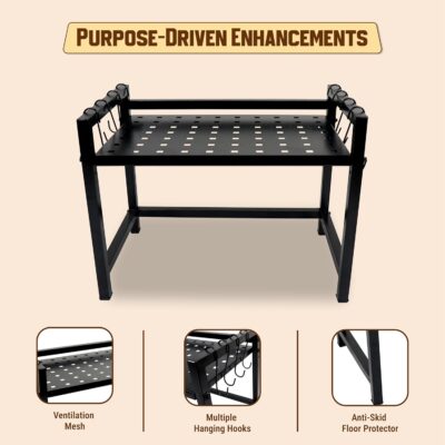 Oven Microwave Stand For Kitchen Platform – Oven Stand – Height Adjustable Rack with 8 Storage Hooks – Easy To Clean, Multi-Purpose Microwave Rack For Kitchen, Oven Stand for Office – Black