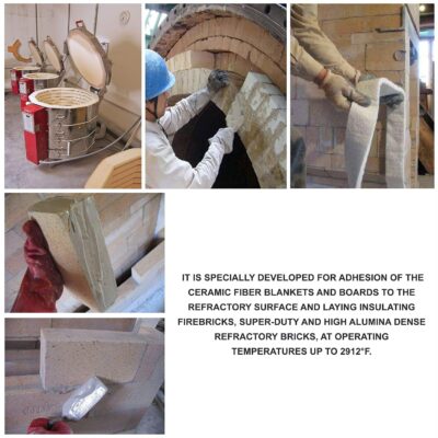 Applications: Effective as a fire resistant cement for air setting in fire bricks and binding ceramic fiber insulation in the gas forge, ceramic kilns, inductions, furnaces, and foundries
