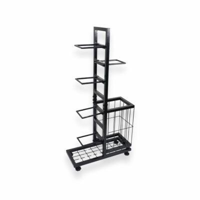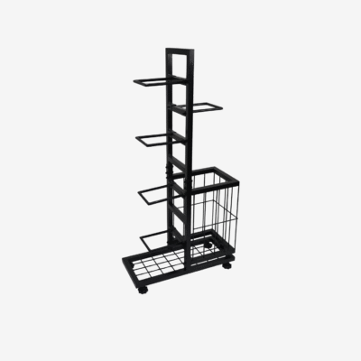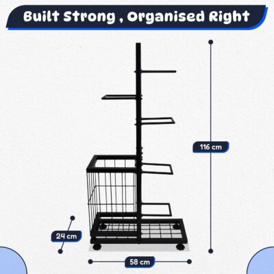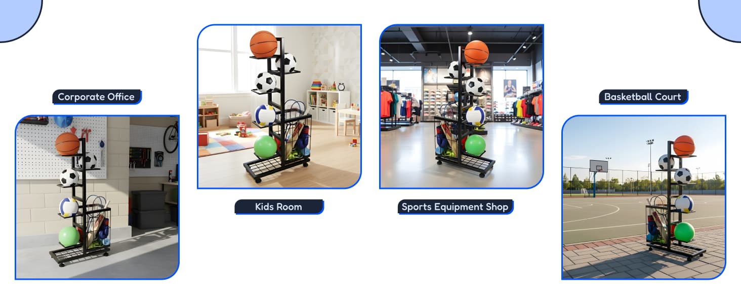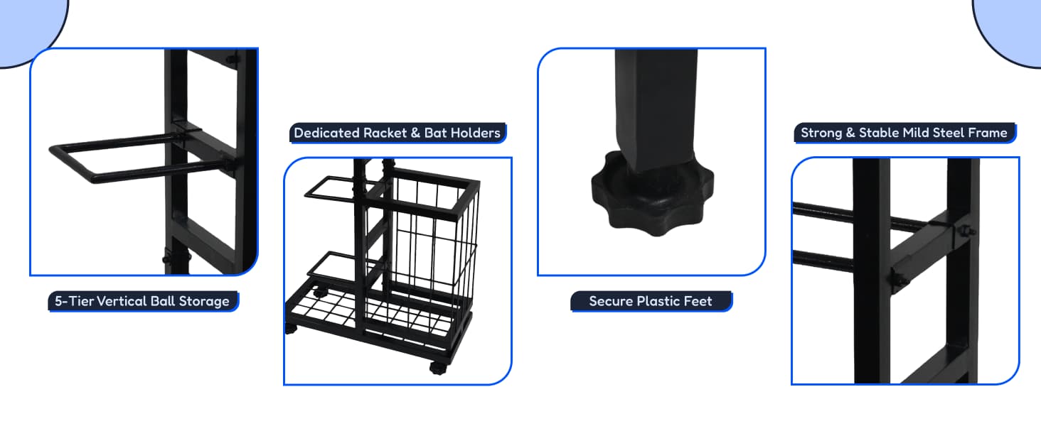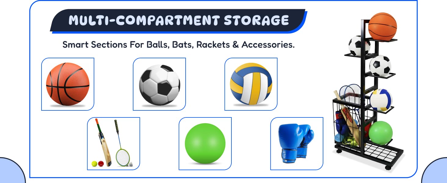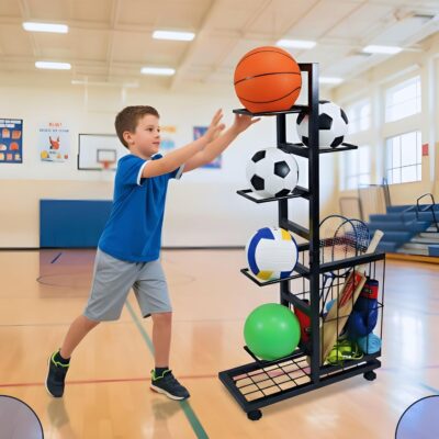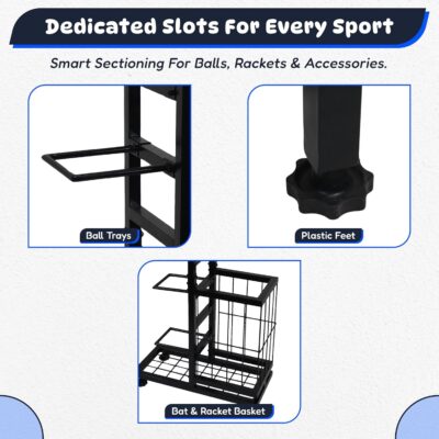 • Multi-Level Sports Organizer: This Five-tier storage holds large balls, side holders for rackets and bats, and a cage for smaller items like tennis balls or shuttlecocks