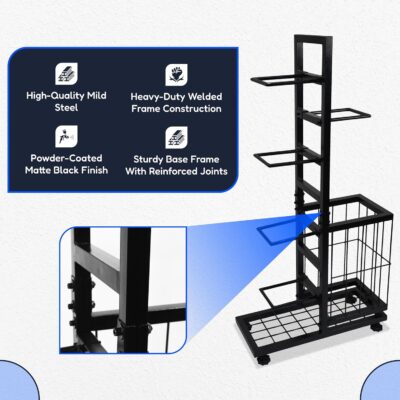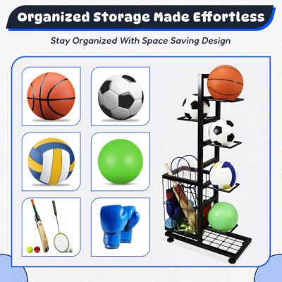 • All in One Equipment Storage: This 5-tier Sports Equipment Organizers holds basketballs, footballs, volleyballs, cricket bats, rackets, and more—keeping all your sports gear in one organized place.